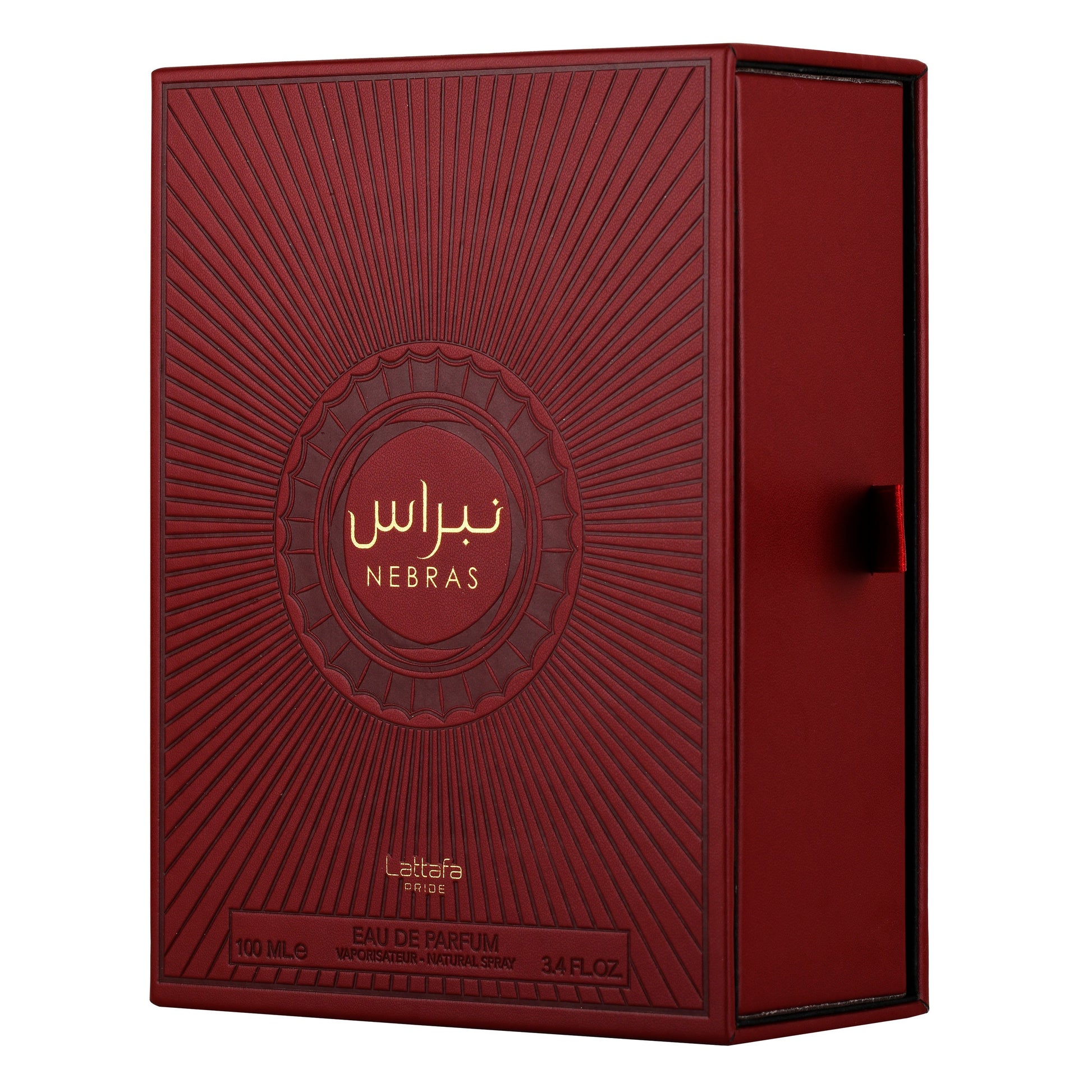 Nebras van Lattafa Perfumes is een nieuw gelanceerde amber-vanillegeur ontworpen voor dames en heren, uitgebracht in 2022. Het opent met topnoten van rode bessen en mandarijn, gevolgd door hartnoten van vanille, cacao en roos. De geur wordt verankerd door basisnoten van suiker, tonkaboon, amber en muskus.