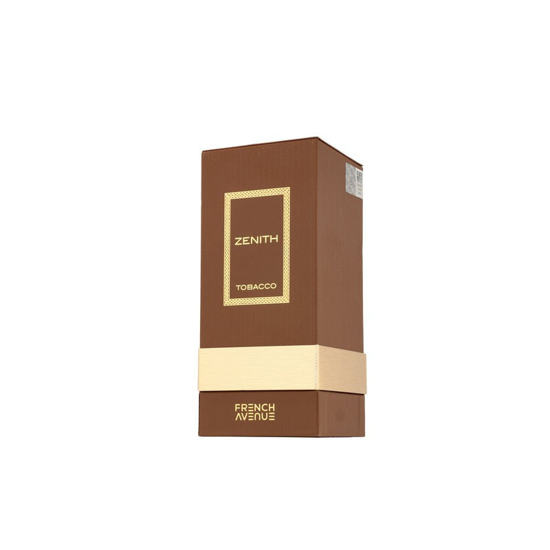 Zenith Tobacco van French Avenue is een uniseks oosterse vanillegeur die in 2025 werd gelanceerd met topnoten van chocolade en mandarijn, een hart van honing, karamel en patchouli en een warme basis van tolubalsem, tonka en mos.