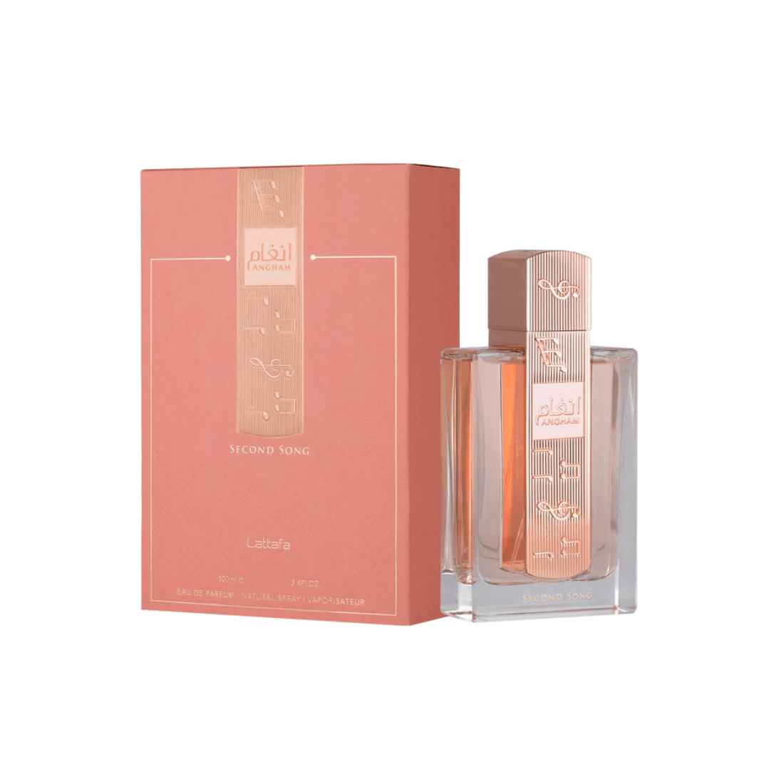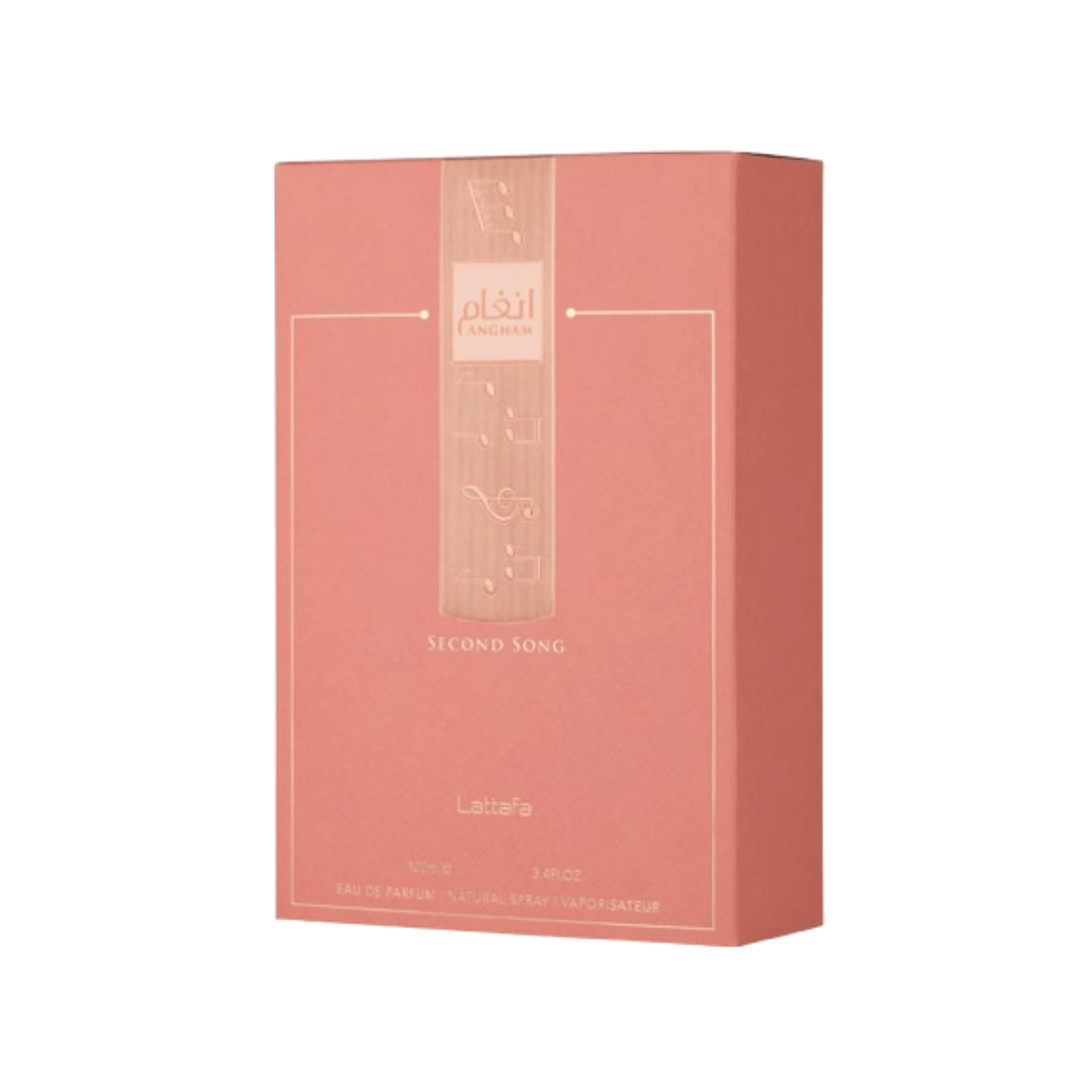 Angham Second Song van Lattafa is een moderne, vrouwelijke geur die opent met bergamot en perenbloesem, overgaat in oranjebloesem, pioenroos en een vleugje praline, en tenslotte eindigt met vanille, tonkaboon, ambroxan en musk voor een zachte, elegante afwerking.