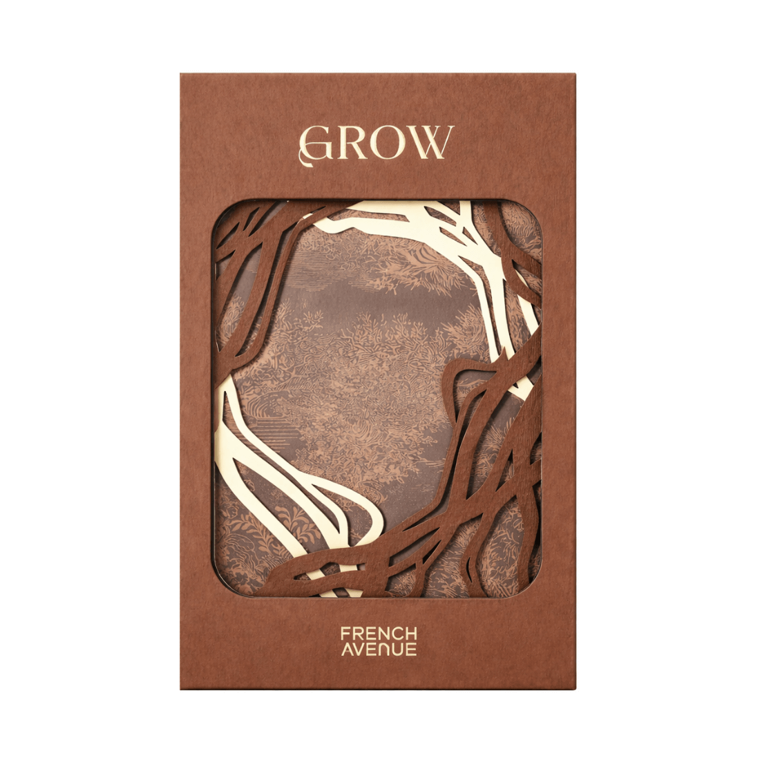 Grow van French Avenue is een oriëntaals-houtachtige unisexgeur uit 2025 met een weelderige structuur. Saffraan, davana, timur, peer en dadels openen de compositie met een fruitig-kruidige intensiteit. Roos, sandelhout, jasmijn en pioenroos vermengen zich met romige akkoorden tot een bloemig hart vol diepte. De basis van cypriol, labdanum, droge houtsoorten, vanille, tonkaboon, musk en Atlasceder zorgt voor een warme, luxueuze en langdurige signatuur.